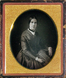 Young Woman in a Striped Dress - 1/6th plate 1840's image in a leather half case, photographer and subject are unknown. This is one of my favourite images, the contrast and clarity are amazing.